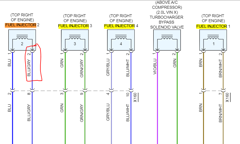See pic below. Note: Checking the injector power is only necessary if you have ignition spark at the cylinder 2 plug. If there is no spark, this isn't needed.
