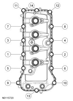 3. NOTE: If the valve cover is not installed and the fasteners tightened within 5 minutes, the sealant must be removed and the sealing area cleaned. To clean the sealing area, use silicone gasket remover and metal surface prep. Failure to follow this procedure can cause future oil leakage.