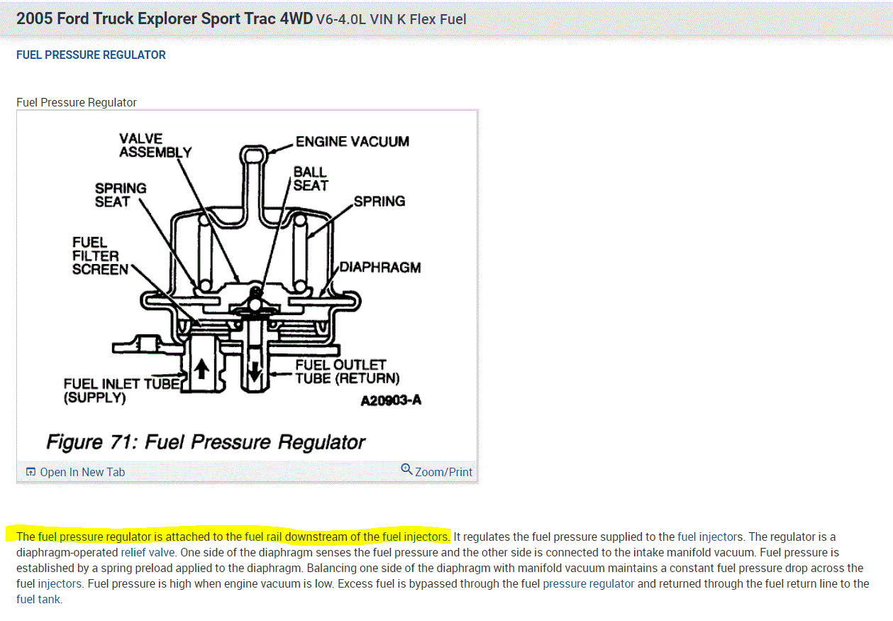 The second pic shows a pic of the fuel pressure regulator and describes its function and location. There will be a vacuum hose to it. Make sure that hose is attached and not cracked or damaged in any way. Then, remove it and check to see if there is fuel in the vacuum hose.