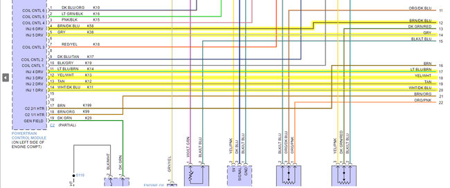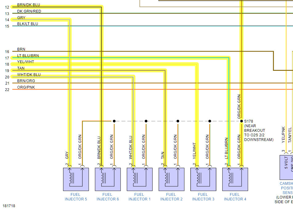 Hello, here's each injector (first page) and where they meet up at the ECM connector C2. If you need anything else, just let us know. The orange/dark green wire is the power feed. (12v)