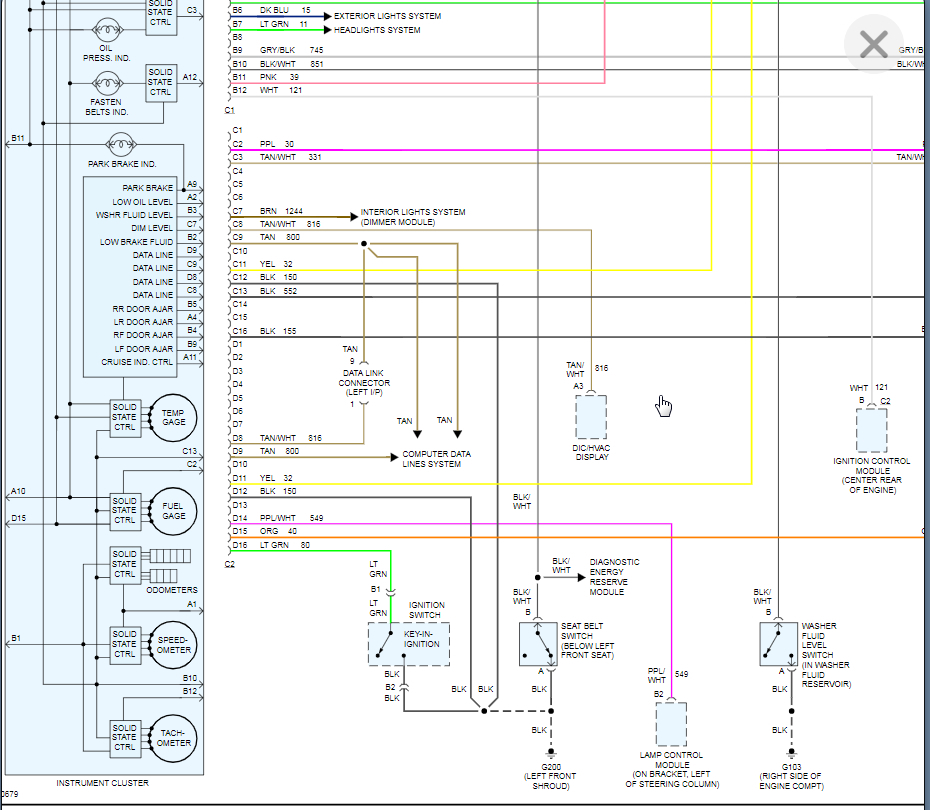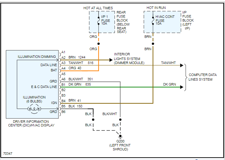 We need to do a couple things to confirm the cluster is the issue because the information center and cluster gauges are run off separate fuses. However, they have two in common so we need to double check these. The IP Fuse block in the left side of the IP has the HVAC Cont Fuse. This would make sense wy your HVAC is not working either. Then we need to go to the rear fuse block under the rear seat, and check the IP 1 fuse. Both these are used for the information and cluster. So once we check these and they are okay, we need to move onto checking power at the cluster and information center.