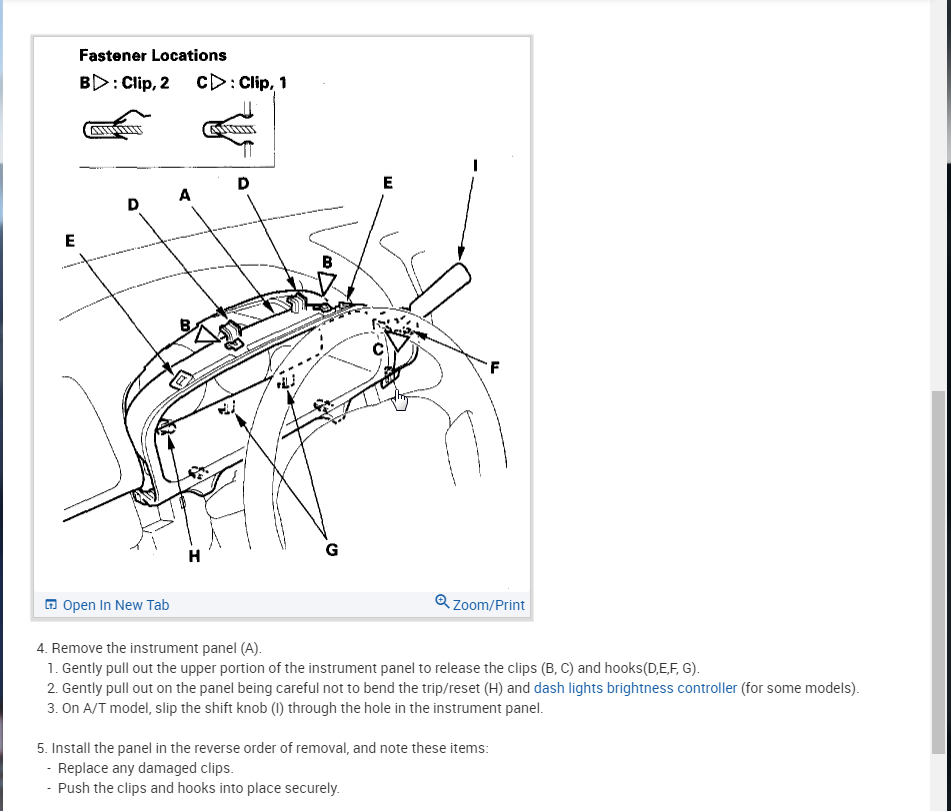 3. Install the panel in the reverse order of removal, and note these items: Ã Â Â Make sure the hazard warning switch connector is plugged in properly. Ã Â Â Replace any damaged clips. Ã Â Â Push the clips into place securely.