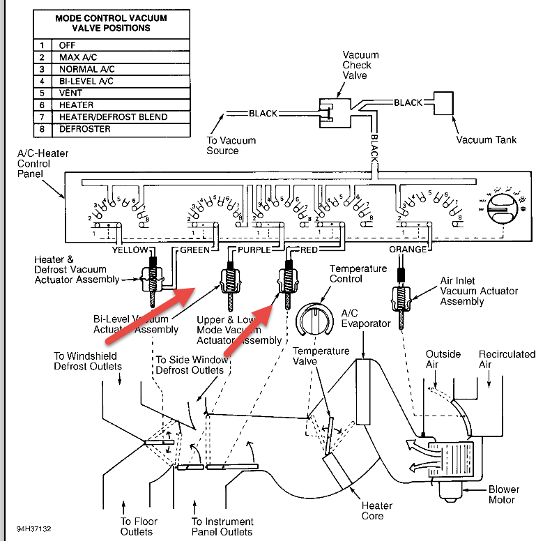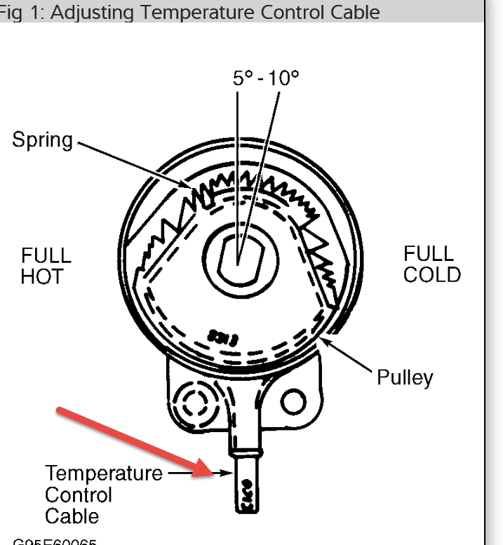 For no hot or cold check for a broken cable. For other check for a vacuum leak or not getting vacuum to motor on heater unit. See pictures.