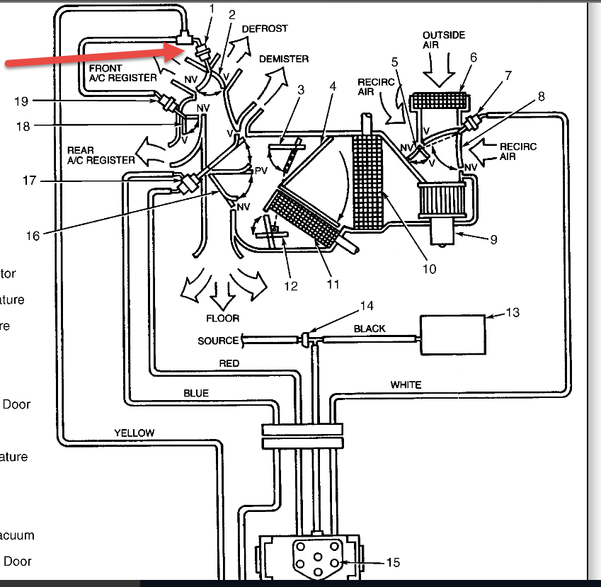 The air has stopped blowing out of the front dash vents. The air still blows out of the top vents near the windshield and the top vents near the side windows.