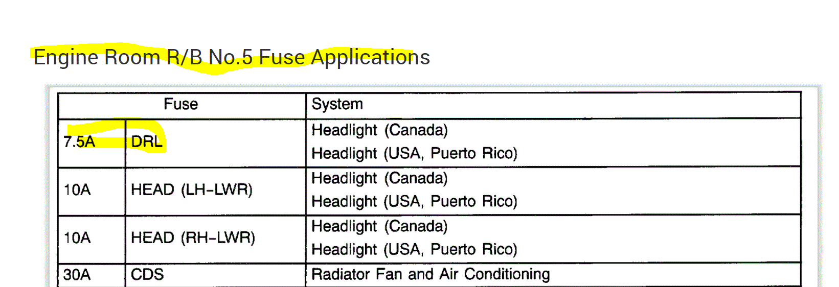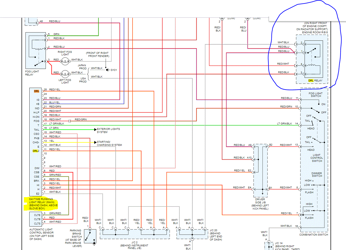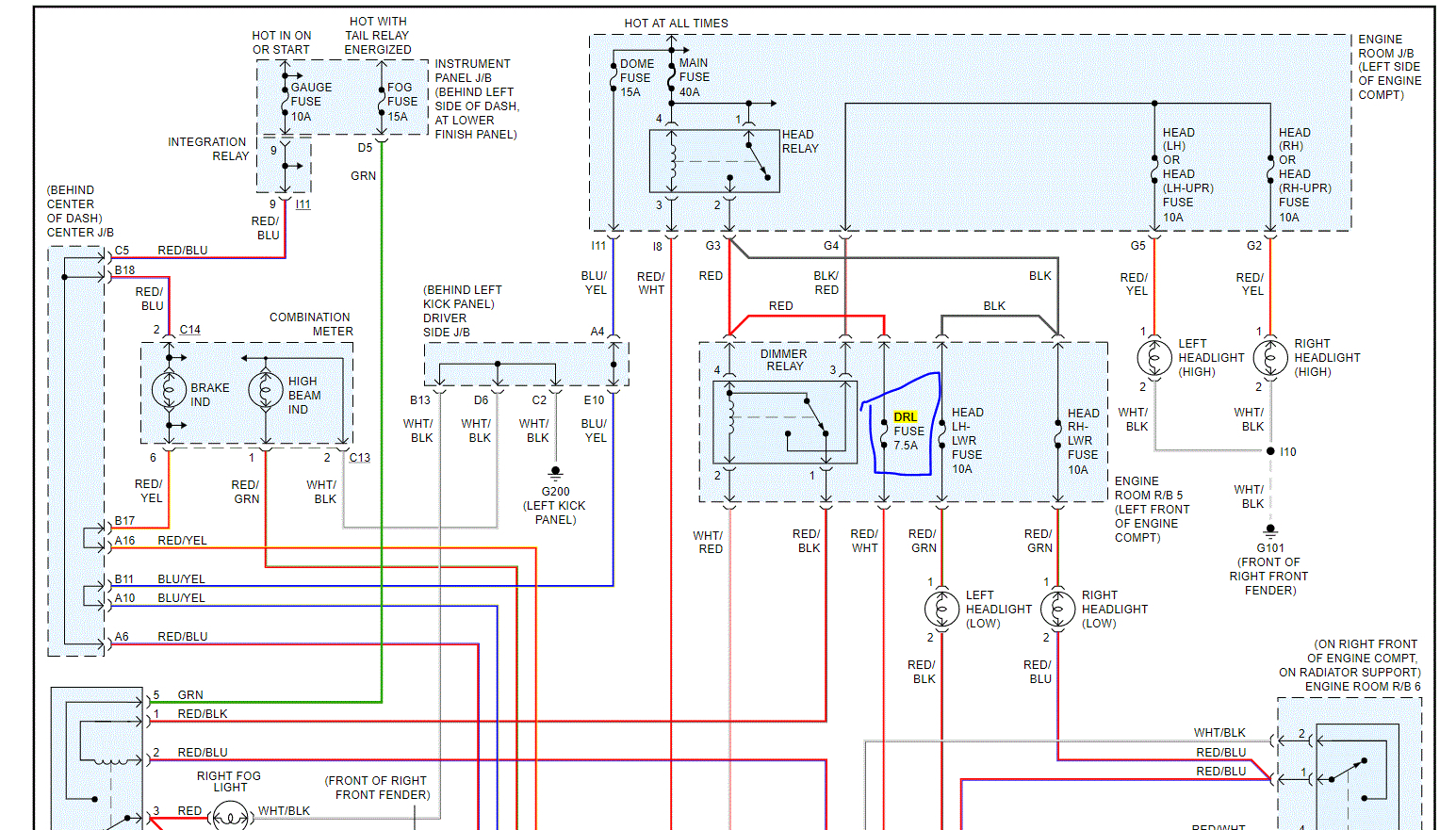 I attached two pics below. They show the entire headlamp / DRL wiring schematic. I highlighted everything related to the DRL. Note the fuse. Is that also the one you checked?