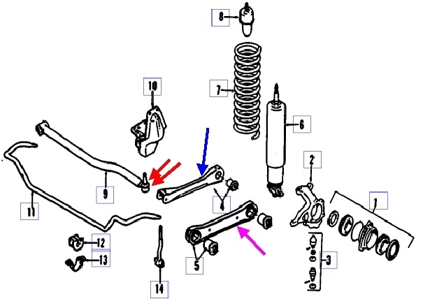 A similar front suspension system is used on full-size Dodge trucks and on your Jeep. In the second drawing, the left side is shown. Of particular interest are the upper and lower control arms, (blue and purple arrows). On the trucks, if you site straight up or down over them, you'd see they are very nearly parallel to each other. There is nothing to keep them from letting the front axle housing shift to either side. (The lower arm is connected to the axle through bushing number 5. The upper arm is connected the same way, but its bushing isn't shown).