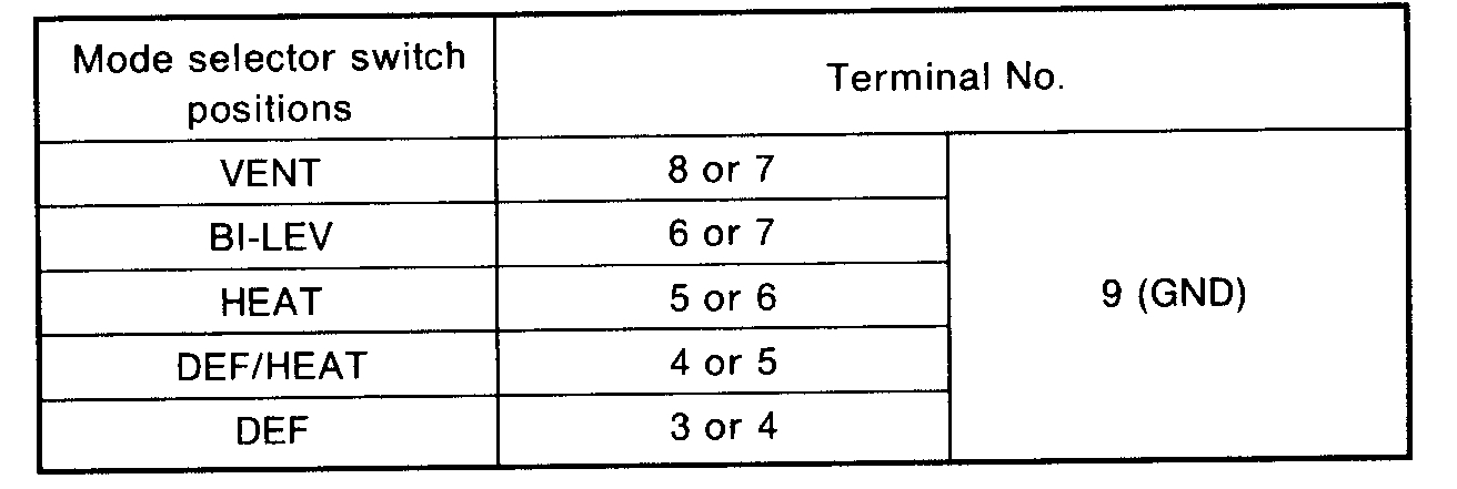 2) Check mode door motor position switch. When the mode door motor is moved to each mode position by using the mode selector switch, check if continuity exists between each terminal as follows: