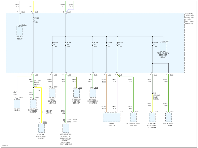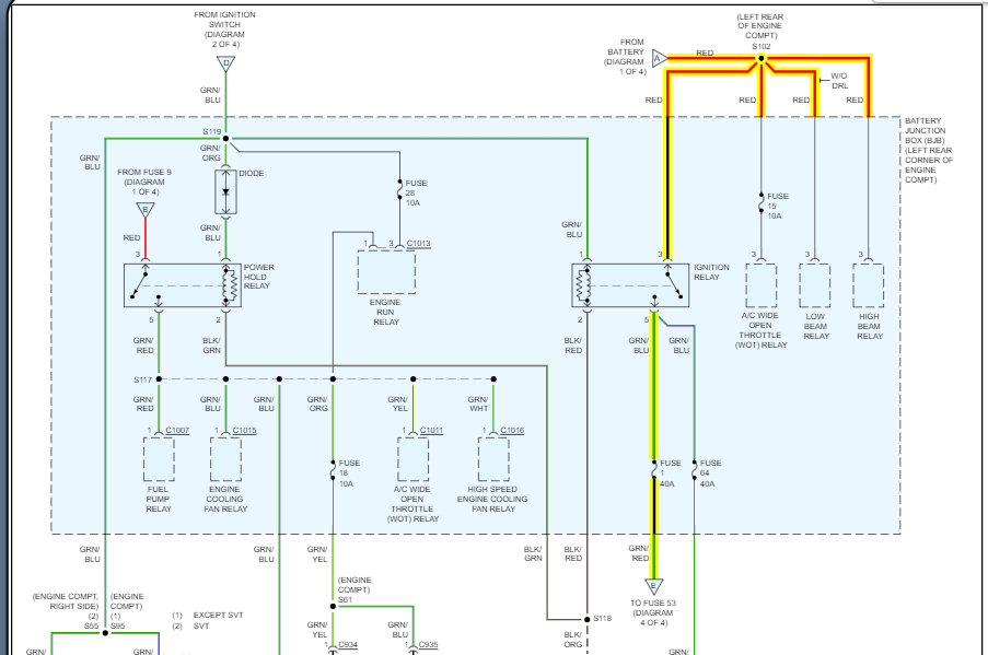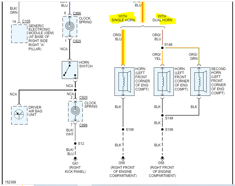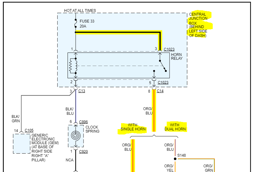 If you have two horns, power is still provided via the orange wire with a blue tracer. However, there is a splice into an orange wire with a yellow tracer. The orange/yellow wires go to the two horns. Again, the black wires splice together and go to ground.