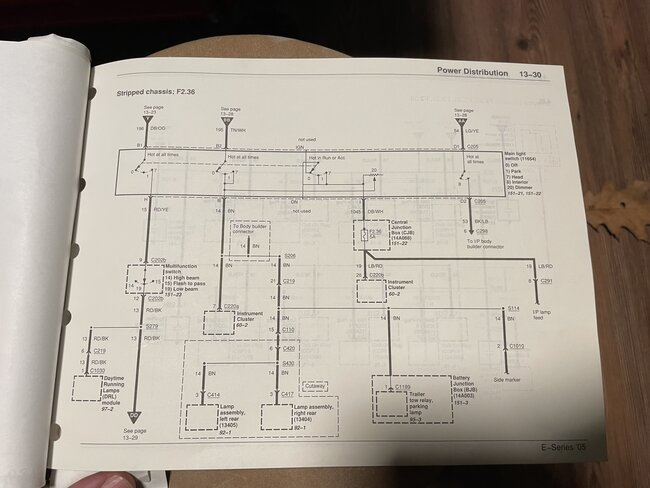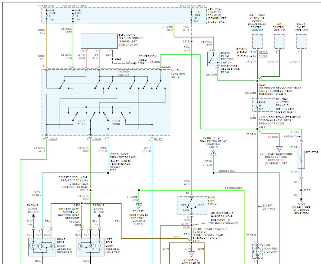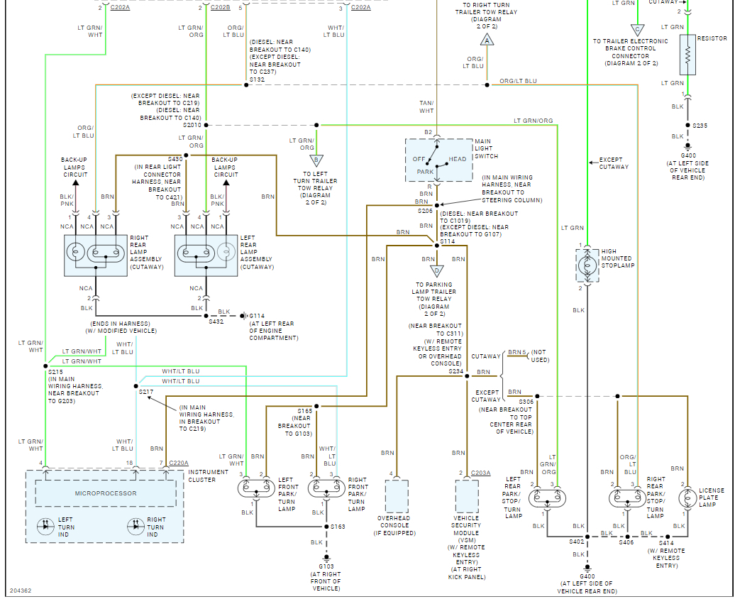 This would explain why when energizing the roof and taillights with 12v directly they all came on but the front stock parking lights near the grille did not. This is because they are not fed off the main brown wire ckt 14. That wire powers the front parking lights and it also powers the instrument cluster for something and it ALSO powers a relay. This relay when energized powers the bn/wh wire for connector 110 and goes all the way back to the corner for all that stuff.