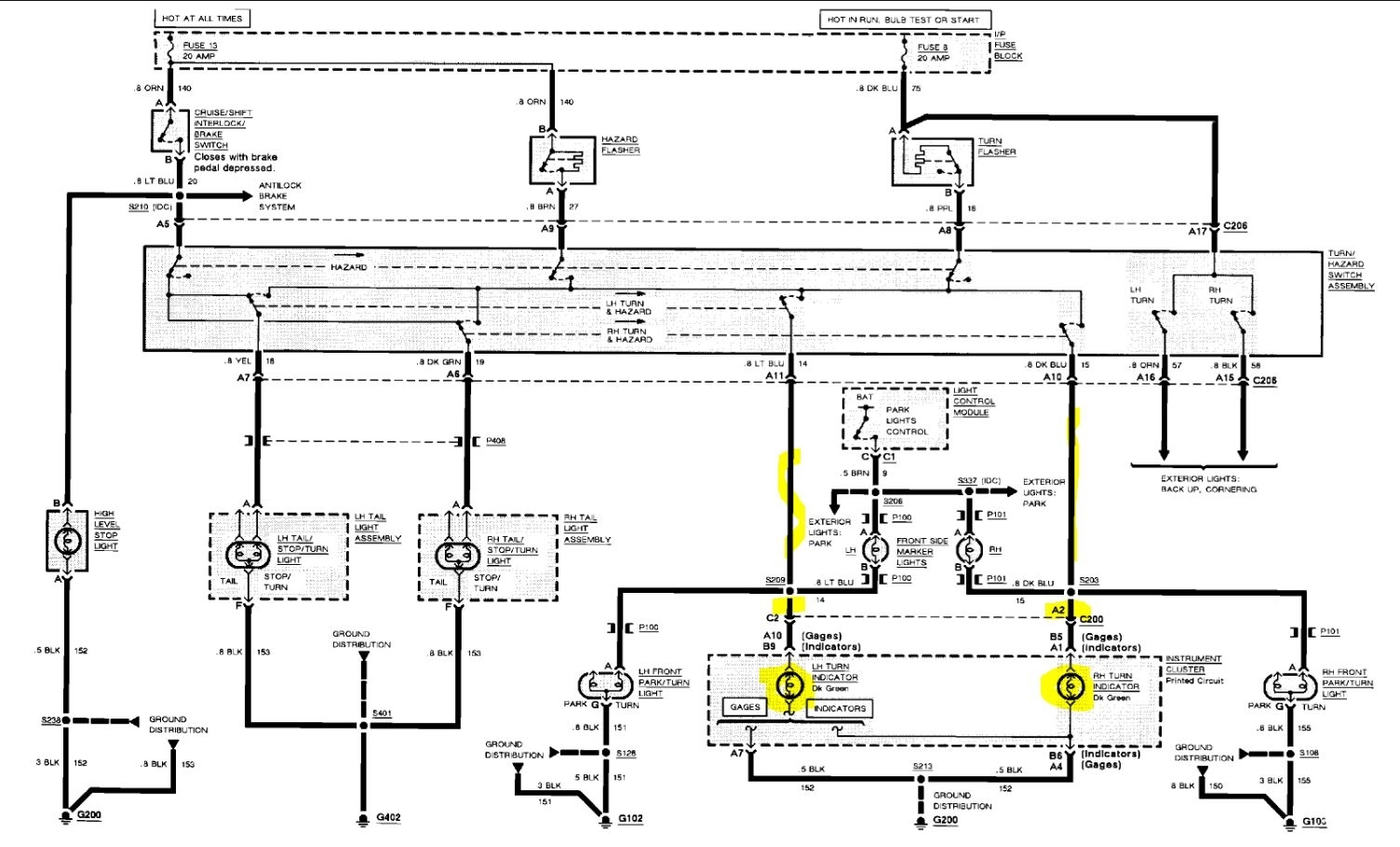 The highlighted pieces are the wires for the dash indicators. I would also start by pulling the dash and testing the two power feeds to the dash bulbs using a test light. The pins are different based on which display you have, if it has a full set of gauges like water temperature, oil pressure and volts the wires will be a light blue (left turn) at pin 10 in connector A and a dark blue (right turn) on pin 5 in connector B If the dash only has an oil light and a charge light then the positions change. The light blue wire is now at pin 9 in the B connector and the dark blue is at pin 1 in the A connector.