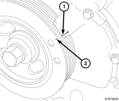 13. Install the balancer and verify that balancer mark (2) and cover mark (1) are aligned.