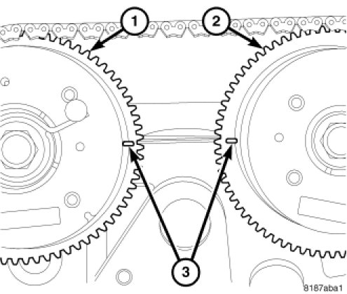 11. Verify that the camshafts timing marks (3) are in the proper position.