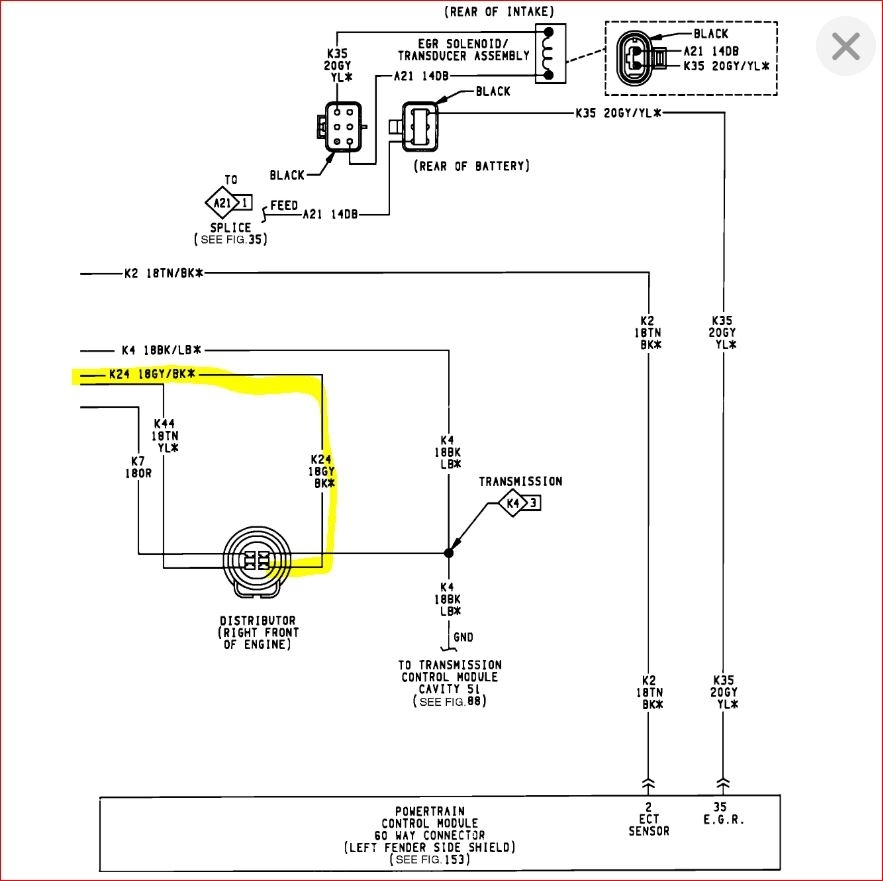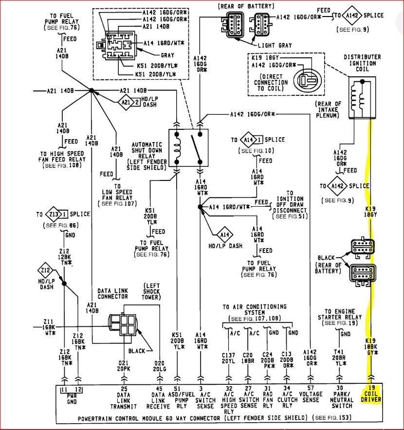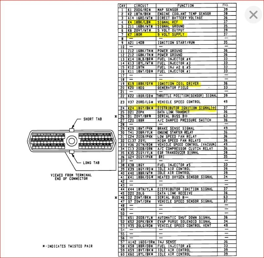 I highlighted a few of the circuits. Specifically the coil driver circuit (this delivers the voltage for the primary side of the coil), the 9 volt supply circuit for the distributor, and the signal return which is what the PCM needs to fire the injectors and coil.