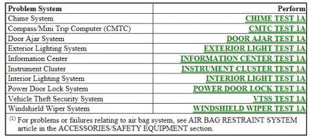Problem SystemPerform Chime System CHIME TEST 1A Compass/Mini Trip Computer (CMTC) CMTC TEST 1A Door Ajar System DOOR AJAR TEST 1A Exterior Lighting System EXTERIOR LIGHT TEST 1A Information Center INFORMATION CENTER TEST 1A Instrument Cluster INSTRUMENT CLUSTER TEST 1A Interior Lighting System INTERIOR LIGHT TEST 1A Power Door Lock System POWER DOOR LOCK TEST 1A Vehicle Theft Security System VTSS TEST 1A Windshield Wiper System WINDSHIELD WIPER TEST 1A