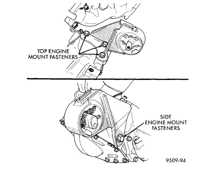 4. Remove the vertical and horizontal fasteners from the engine side bracket. Remove the engine mount assembly.