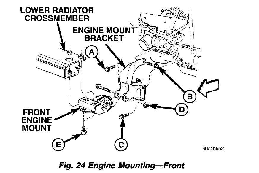 2. Remove the front engine mount through bolt from the insulator and front crossmember mounting bracket.