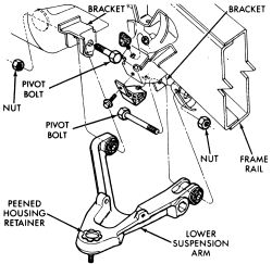 8.Pull the arm down and remove the spring with the rubber isolation pad from the vehicle. Remove the lower control arm pivot bolts from the crossmember and remove the arm from the vehicle.
