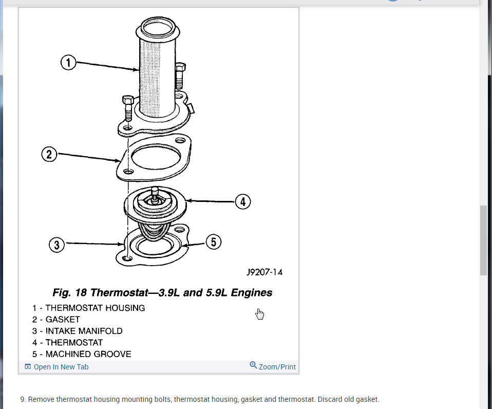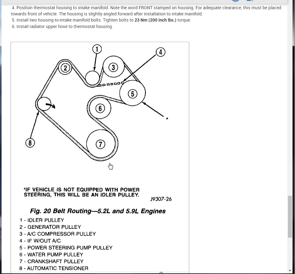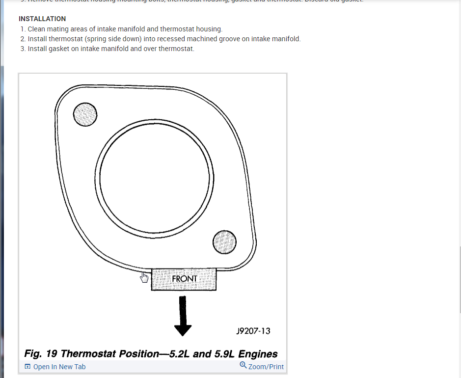 The thermostat housing may have the word FRONT on it (3.9L, 5.2L, 5.9L); this goes towards the front of the vehicle.