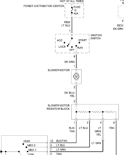There should be two wires to the blower. The positive side (dark green) feeds from the fuse through the ignition switch to the blower motor. The negative side (dark blue w/yellow) is the ground side and goes to the blower resistor and through the speed switch to ground.