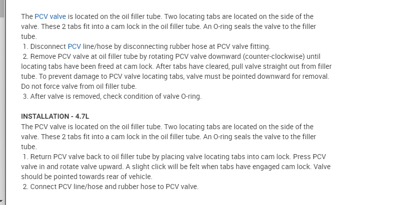On the 4.7L the PCV is located on the oil filler tube, so I am attaching the info below from the manual on how to replace this.