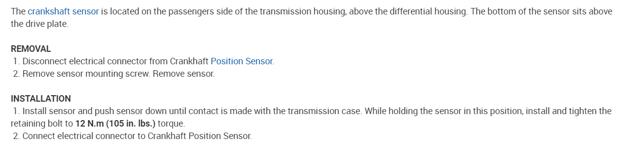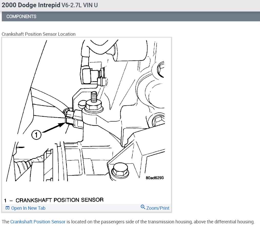 The crankshaft sensor you are looking for is located on the passenger's side of the transmission housing, above the differential housing. The bottom of the sensor sits above the drive plate. Check out the diagrams (Below). Please let us know if you need anything else to get the problem fixed.