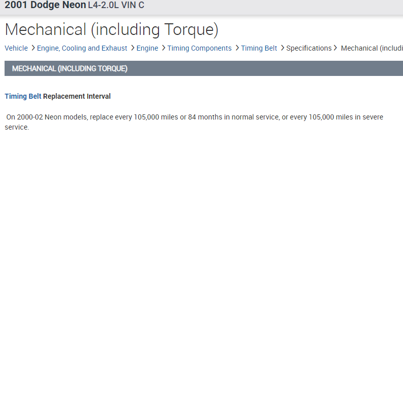 On 2001 Neon models, the timing belt needs to be replaced every 105,000 miles or 84 months.