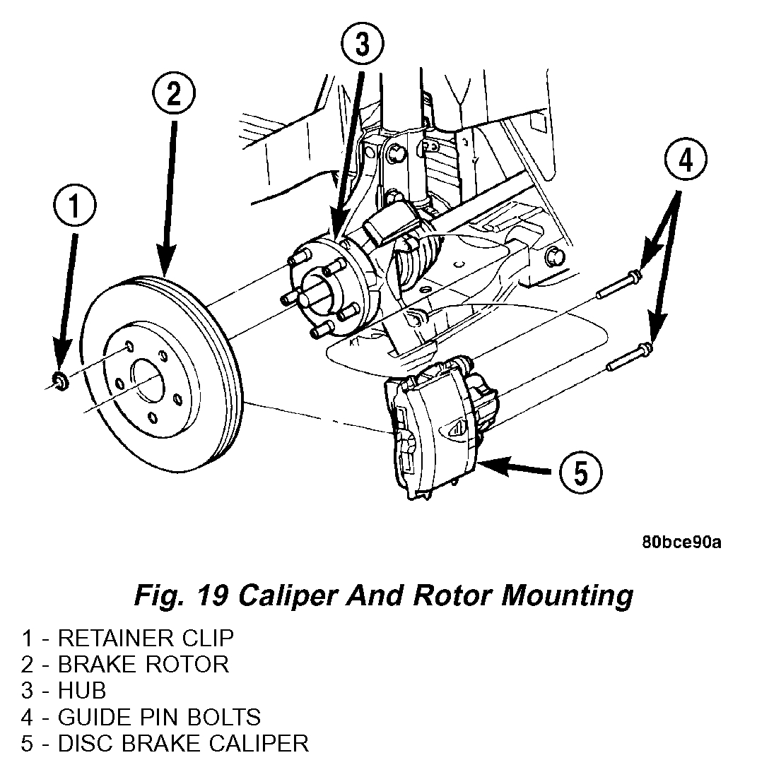 4. Remove the two brake caliper guide pin bolts (Fig. 19).