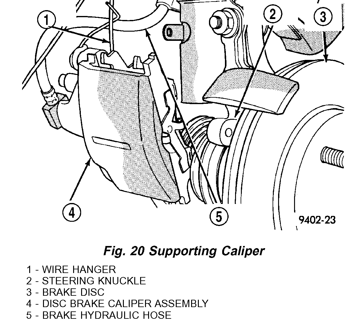 6. Support the caliper using a wire or cord to prevent the weight of caliper from damaging the brake hose (Fig. 20). Do not let the caliper hang by the brake hose.