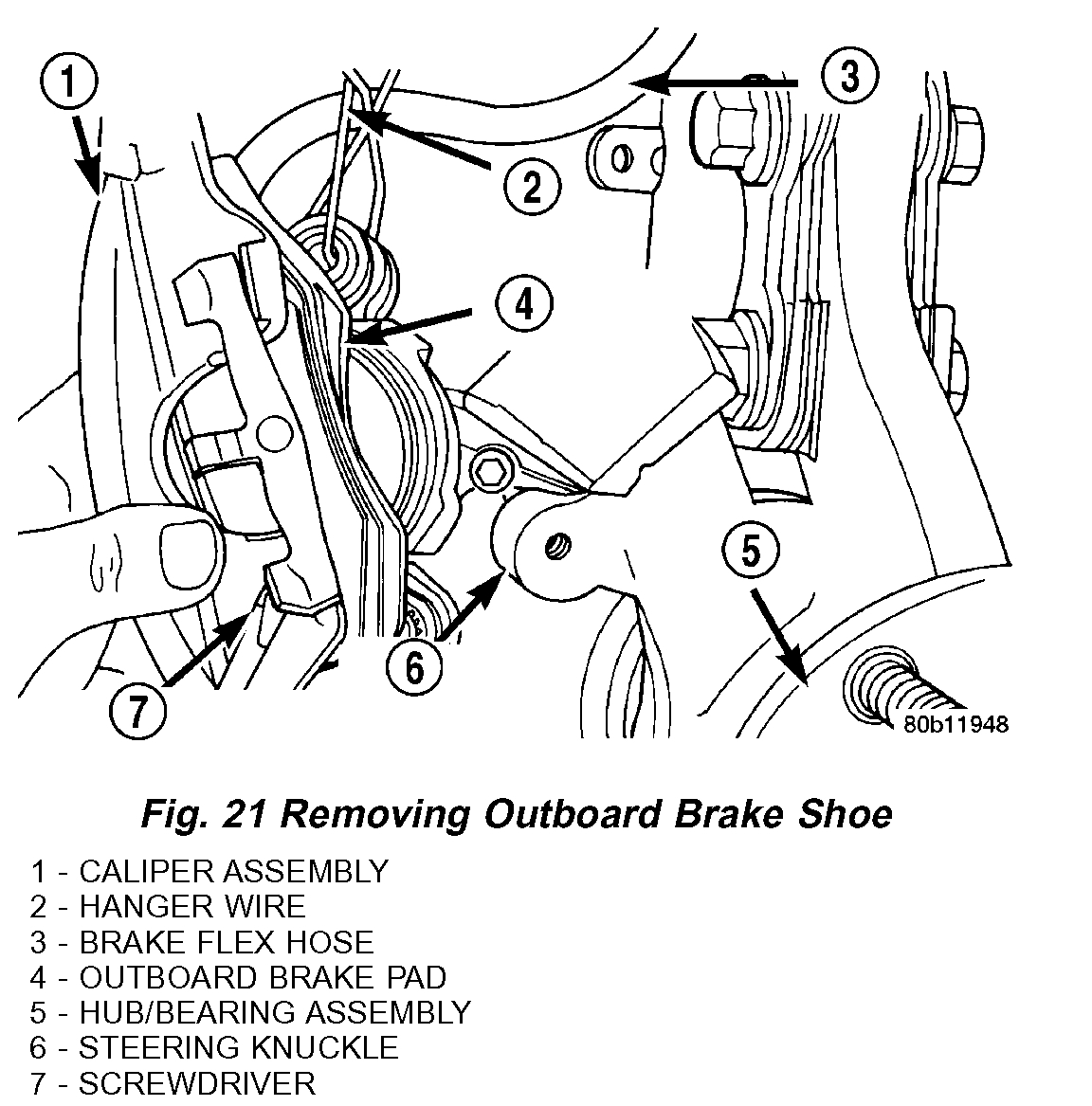 7. Remove the outboard brake shoe from the caliper by prying the shoe retaining clip over the raised area on the caliper. Slide the brake shoe down and off of the caliper (Fig. 21).