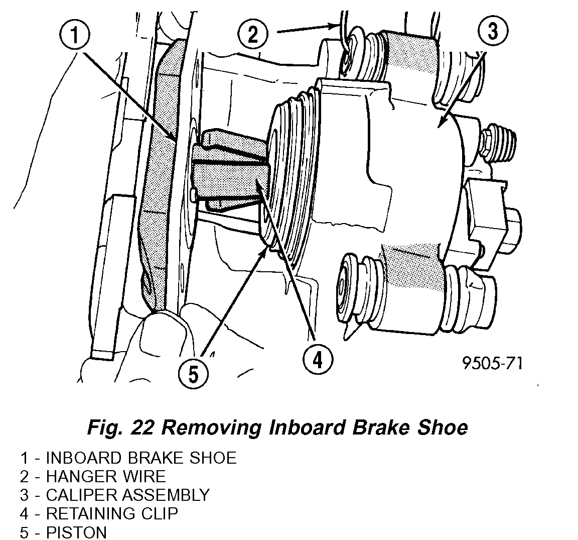 8. Pull the inboard brake shoe away from the caliper piston until the retaining clip is out of the cavity in the piston (Fig. 22) and remove the shoe.