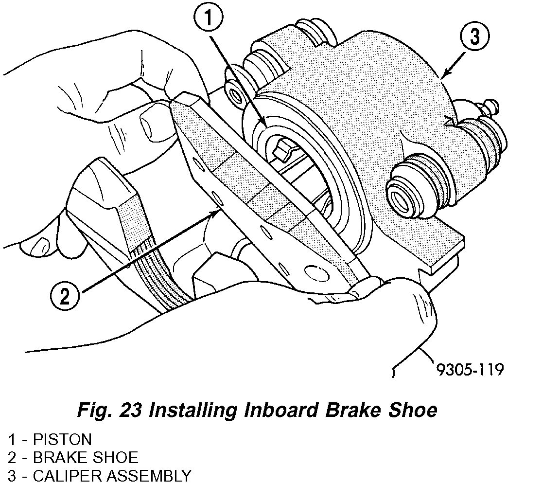 4. Install the inboard brake shoe into the caliper piston by firmly pressing the shoe in with the thumbs (Fig. 23). Be sure the inboard brake shoe is positioned squarely against the face of the caliper piston.