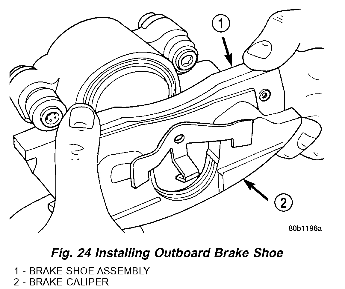 5. Slide the new outboard brake shoe onto the caliper (Fig. 24).
