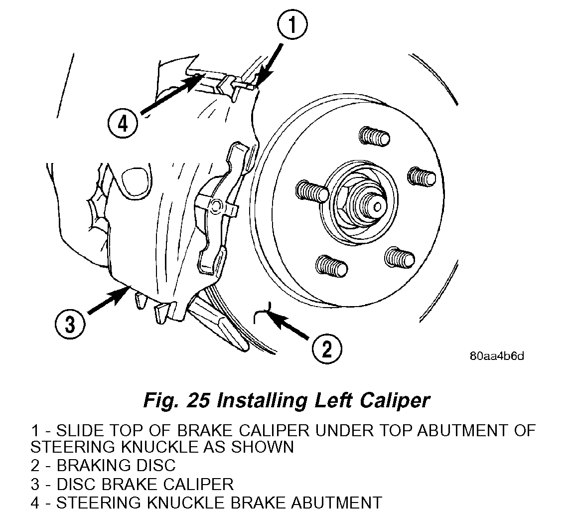 7. Install the disc brake caliper (with pads) on the brake rotor and steering knuckle. The left side caliper is installed by first sliding the top of the caliper past the top caliper slide abutment on the steering knuckle to hook the top edge of the caliper, then pushing the lower end of the caliper into place against the knuckle (Fig. 25). The right side caliper is installed by first sliding the bottom edge of the caliper past the lower caliper slide abutment on the steering knuckle to hook the lower edge of the caliper, then pushing the top of the caliper into place against the steering knuckle.
