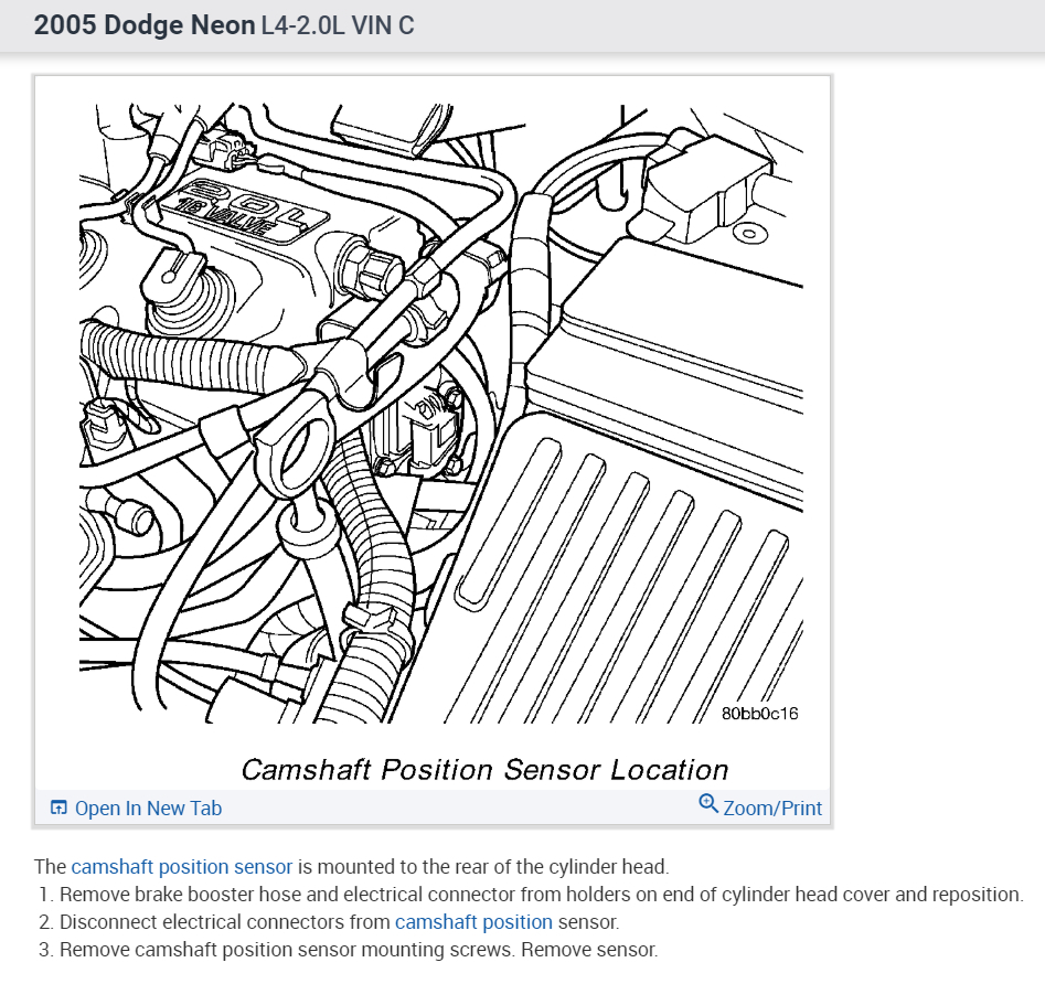 2.Turn ignition off. Disconnect connector at camshaft position sensor. Camshaft position sensor is located on rear of cylinder head, just below valve cover. connector for corroded, pushed out, miswired or damaged terminals. If terminals are not corroded, pushed out, miswired or damaged, go to next step. If terminals are corroded, pushed out, miswired or damaged, repair as necessary. Perform TEST VER-5A .