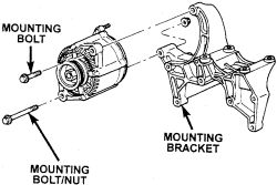 2. Install the alternator mounting bolts and tighten to 40 ft. lbs. (54 Nm) for 2.5L and diesel engines, 30 ft. lbs. (41 Nm) for others.