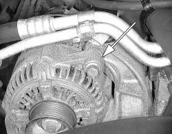 6. Remove alternator mounting bolts. Note any shims or spacers in the assembly.