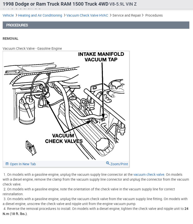 Ok I have the above truck 5.9 when i'm driving and accelerate the AC stops coming out the vents and comes out the defrosters, if I let off the gas it comes back out the vents. Went to Dodge they said it was a bad vacuum check valve, another guy there said 98's didn't have the check valve, anyone else ever have this problem or know how to fix it, winter is coming and it does the same thing with the heat, thanks in advance for any help with this