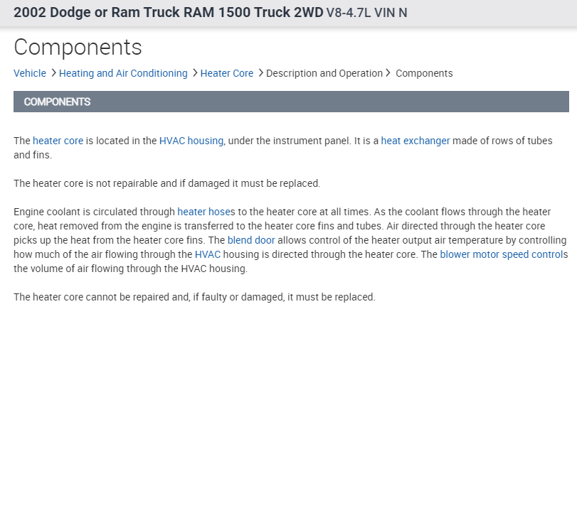 A heater core is positioned inside the car and is part of the HVAC system. Hot engine coolant is run through the core which air is blown through via the blower motor which ...