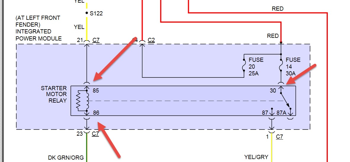 A second method involves making four tests in the relay socket with a test light. Ground the test light to the battery negative post, then probe the four terminals in the socket. Disregard the unused fifth one in the middle. One must have 12 volts all the time. One must have 12 volts only when the clutch is pressed and the ignition switch is in the "crank" position.