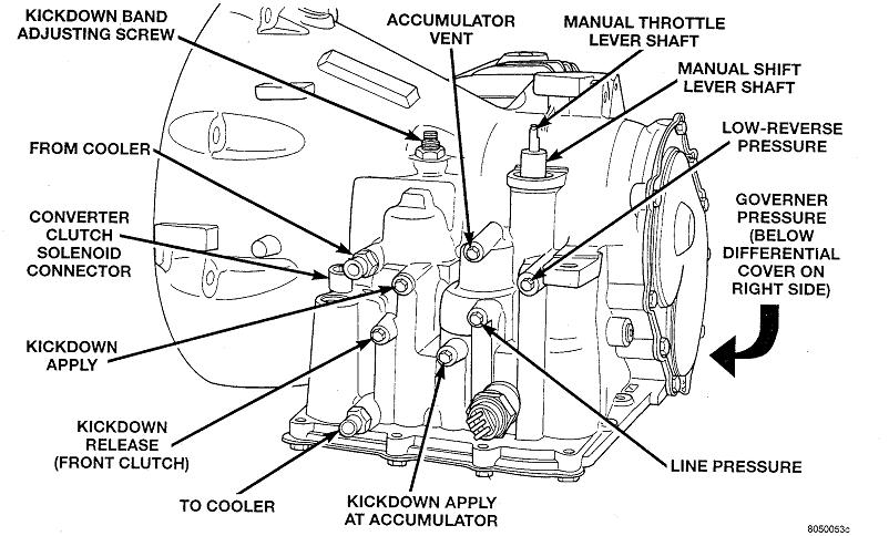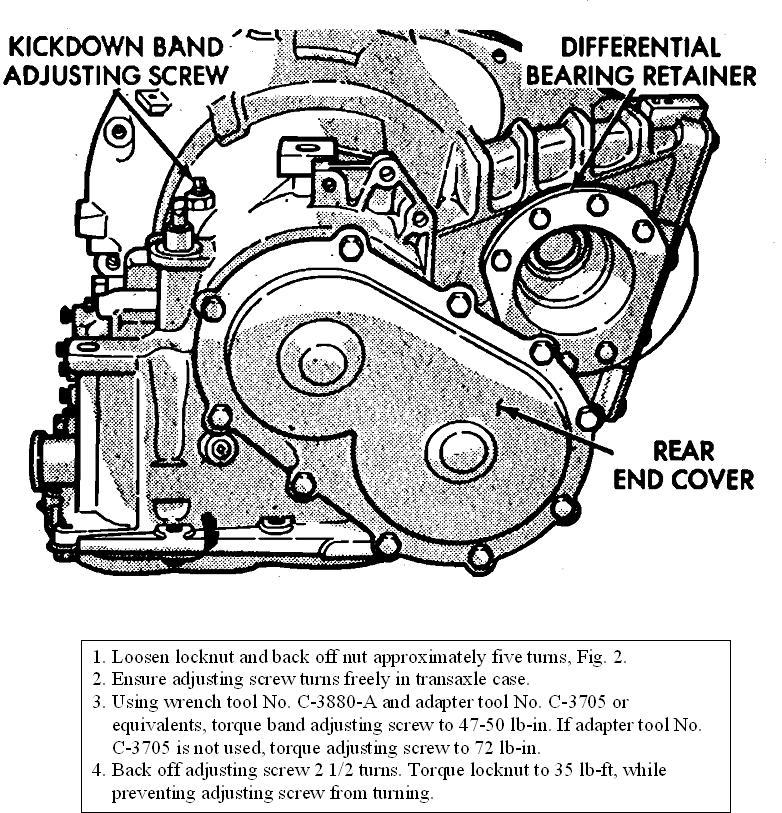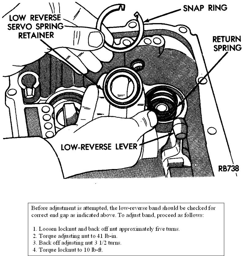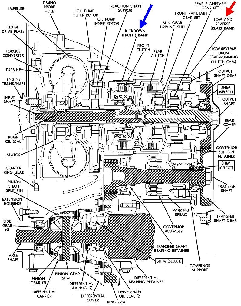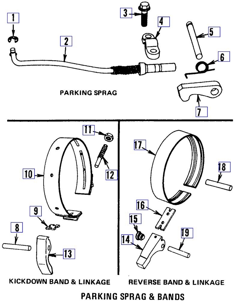 The bands are adjustable but doing so isn't likely to solve a slipping problem. Two different transmissions were used for this model depending on which engine you have. The 3.0L V6 used the computer-controlled 4-speed transmission. These drawings pertain to the more common hydraulically controlled 3-speed with the 2.5L 4-cylinder engine.