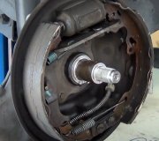 If you van see a brake caliper behind the wheel that looks like the one on the front, you need brake pads (your car has 4 wheel disc brakes). If you see a steel brake drum (looks like an upsidedown pot) and can not see the brakes or caliper, you need brake shoes.
