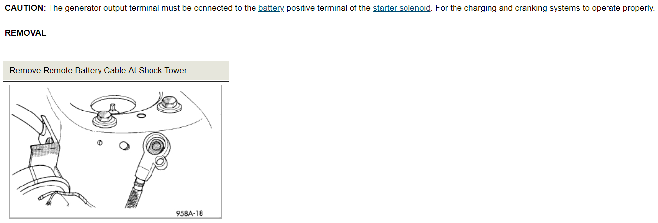 Disconnect the negative battery cable from the left strut tower. The ground cable is equipped with a insulator grommet which should be placed on the stud to prevent the negative battery cable from accidentally grounding.