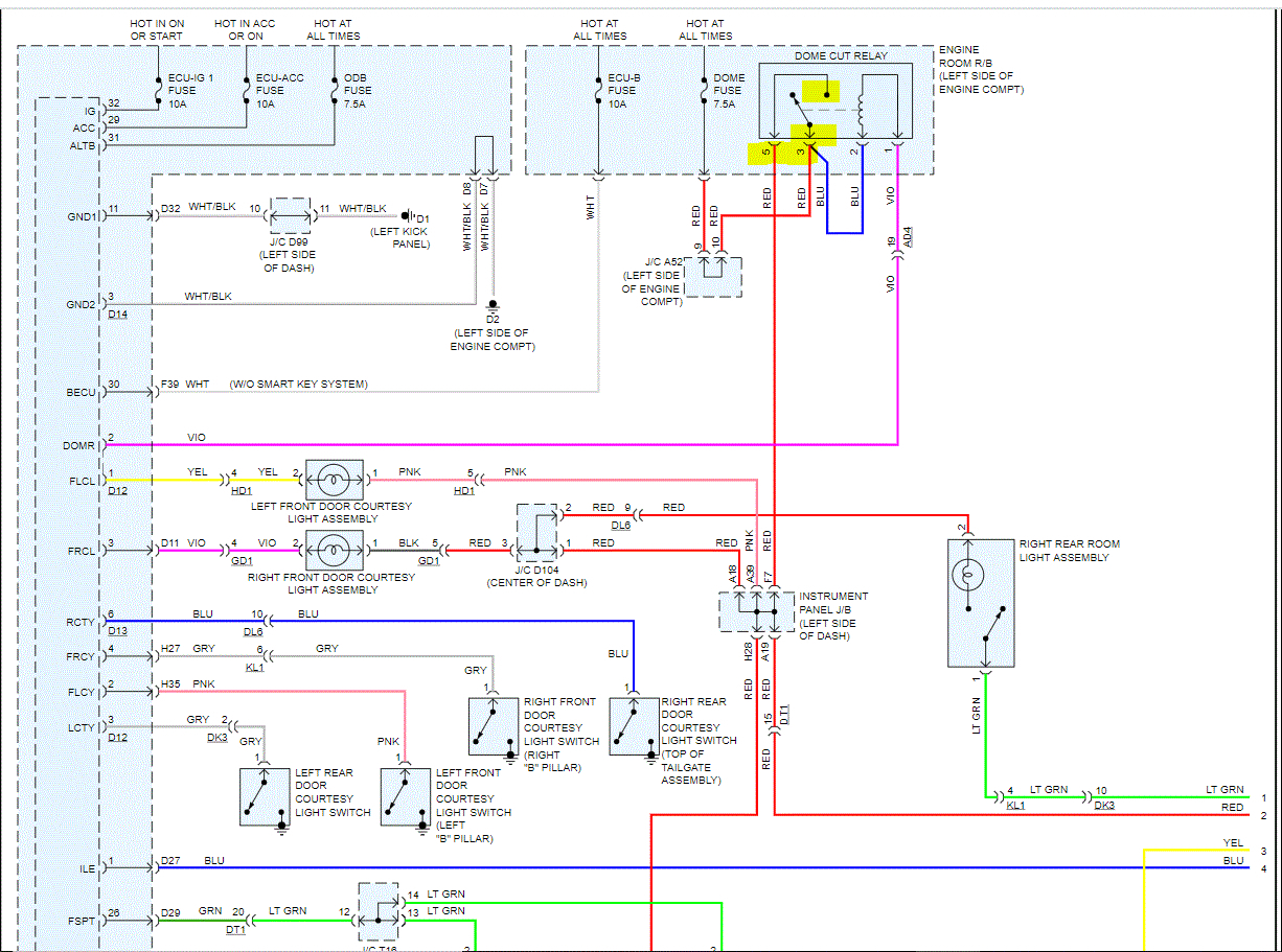 I need to know which pins you are jumping. If you look below, I attached the entire wiring schematic for the dome lights/interior courtesy lighting. Let me know which you are jumping. I have a feeling it is pins 3 and 5 in the pic. If that is the case, I need you to check the purple wire (pin 1) for power when the door is open.