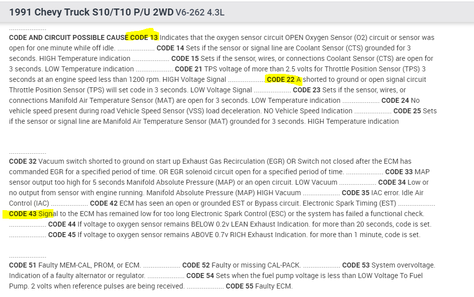 The codes show a few different things. The two that have the most interest to me are the 13 and 22. This vehicle should have a throttle body injection, correct? If it does, the first thing to focus on is code 13. This indicates an open circuit with the oxygen sensor. Check to make sure nothing is damaged, the wiring is in good condition, and nothing has melted due to heat. If everything looks good, test the sensor.