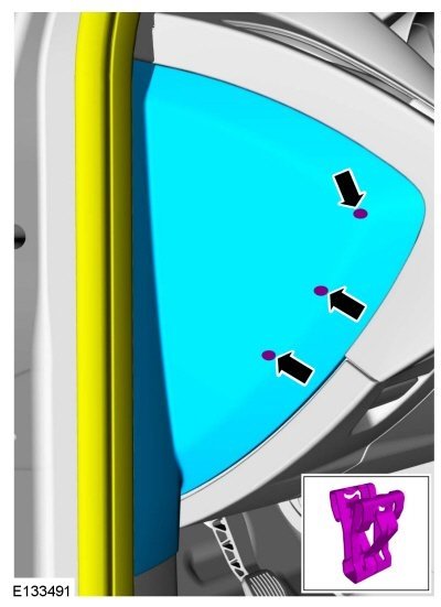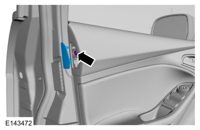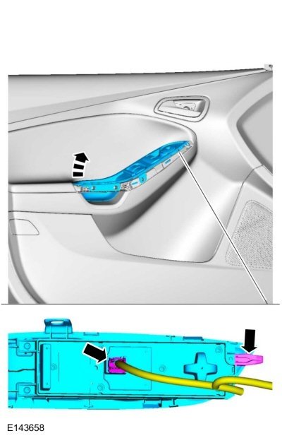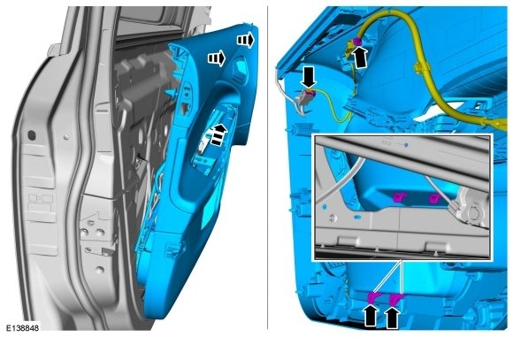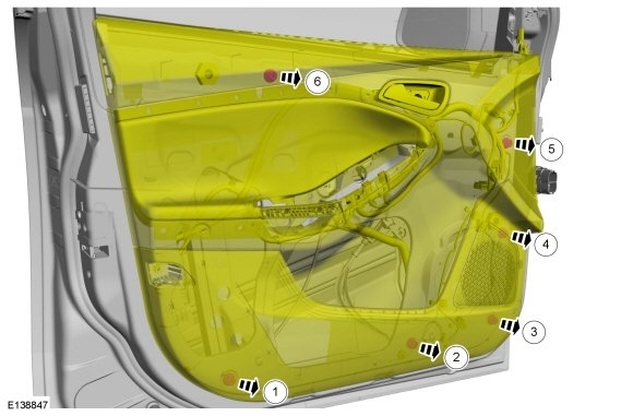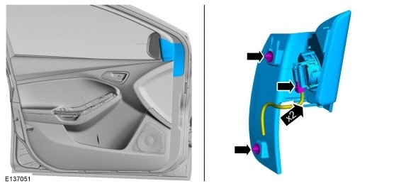 Disconnect the interior door handle cable and the door trim panel electrical connectors and remove the front door trim panel.