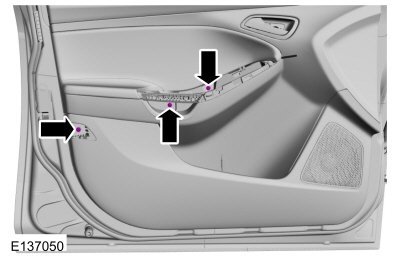 Remove the front door trim panel upper screw cover and remove the door trim panel screw.