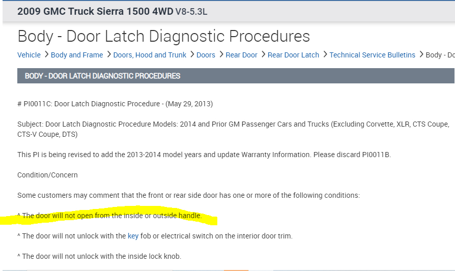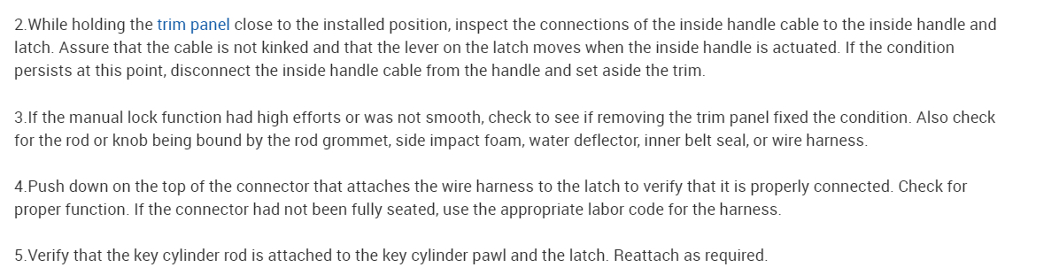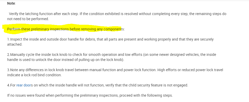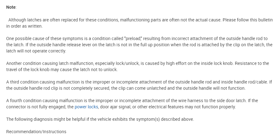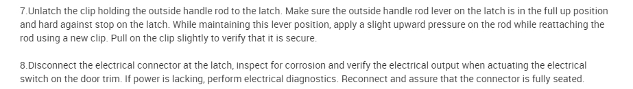 Both of my rear door handles broke. I replaced them. All was fine for a few days. Then the driver's side rear would not open from inside or outside. Took the panel off and got the latch open. Open and closed it numerous times from the outside and was good. I opened and shut from inside by grabbing the little ball that attached to the inside door handle, and that worked. Reassembled the door and could not open from in or out again. Took apart again and same thing, worked until I Reassembled it.