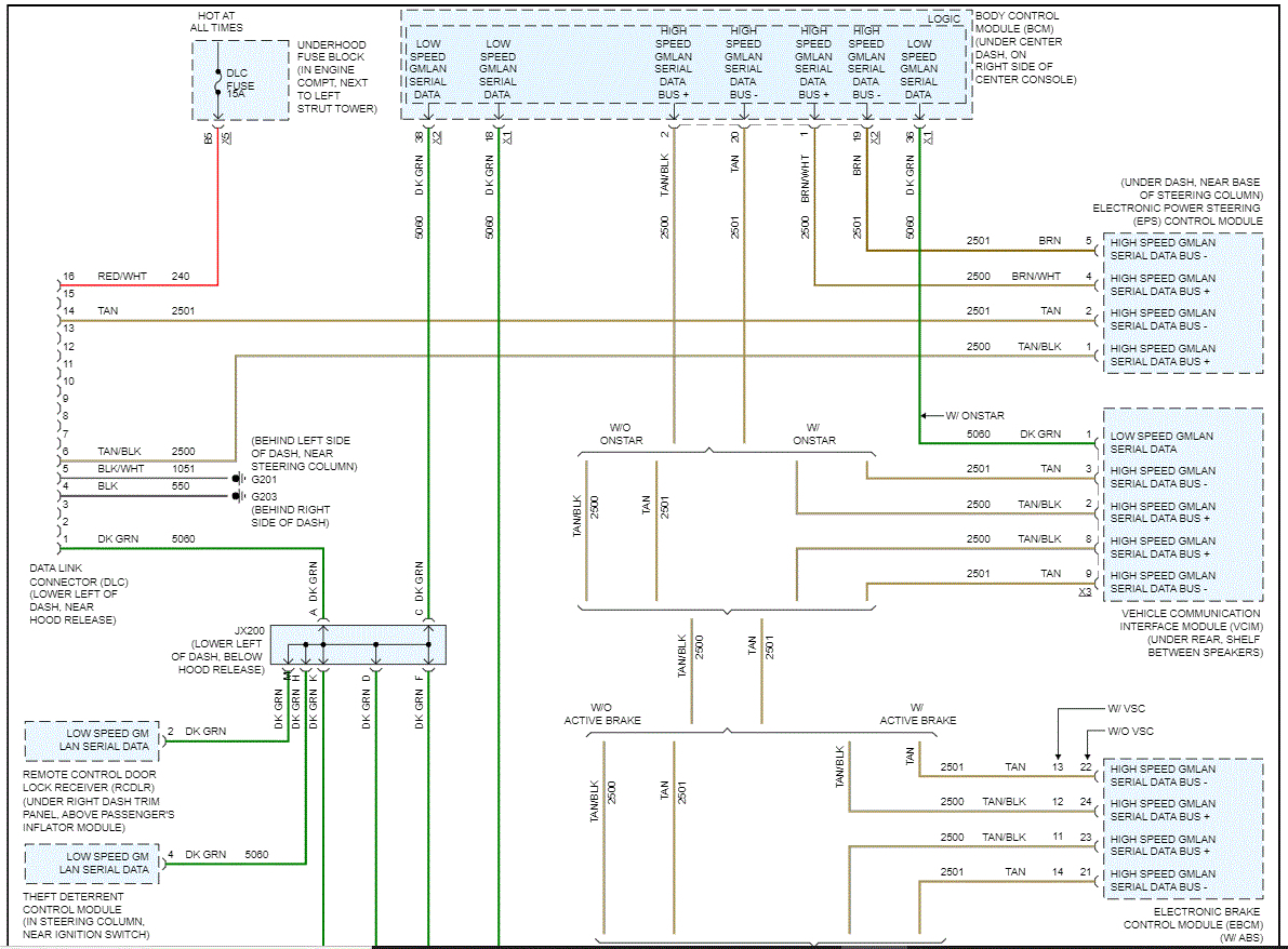 Just to let you see it, I attached the schematic below for the computer data lines. Notice there are both high speed and low speed. Notice that all are basically the same colors via high speed. The low speed are all the same colors. That's because that is the single wire running from module to module. Ugh!!! LOL Also, the low speed will always be a single wire circuit that runs basically from a 0v to 5v signal to communicate between circuits that don't require an instant response. A high speed will usually be two wires (often twisted together).