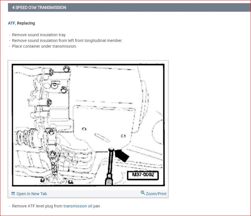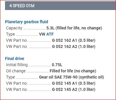 Also, I show only one transmission option for this vehicle which is a 4 speed 01M. Is this the transmission that you have? If so, this is a fill for life transmission and does not require servicing unless there is something wrong. At that point you would go in and fix it and then refill it with the recommended fluid. I attached the recommended fluid and amount to ensure you filled it with the proper amount (5.3L).