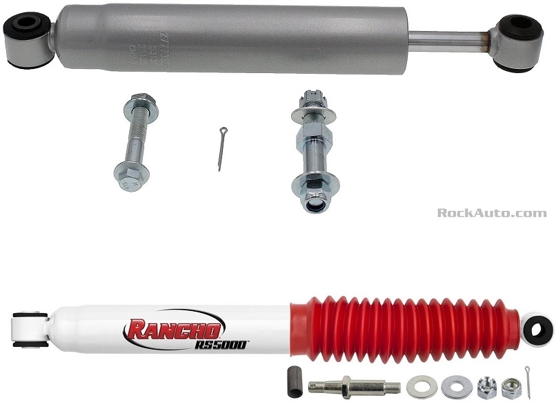 This part looks like a standard shock absorber, except it moves in both directions with equal resistance. Shock absorbers pull apart really hard, and push together very easily, so they are not acceptable as a damper replacement. You'll find this attached to the front crossmember on one end, and to the steering linkage on the other end.